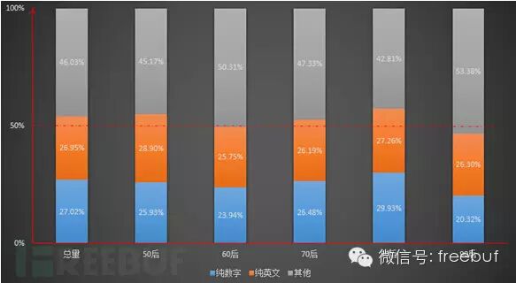我们发现,该网站有一半以上的用户还在使用纯数字或纯英文这种单一的密码设置形式,使用组合密码的用户只占了46%。在如此高敏感高风险的网站中,居然有这么多用户的密码设置这么简单。在这之中,尤其以80后使用组合密码的为最少,只占了42%。而90后使用组合密码的超过了一半,为53.38%。看来90后在密码安全意识上是要略强过80后的。