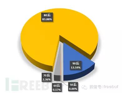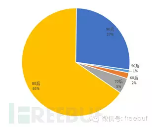 先来看一下该次泄露数据的总体情况。在本次事件中,共有131389名用户的信息遭到泄露,其中主要以80和90后为主,80后占比最高,为65%,是90后的一倍多。从目前来看80后仍然是泄露事件的主力军。