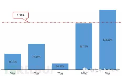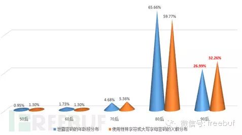 从泄露的数据来看,只有163人在自己的密码中使用了大写字母、下划线、@等特殊字符,这着实不怎么样。不过在这不幸的数据之中,还是发现了令人稍微兴奋的东西。虽然使用特殊字符的用户不多,但90后的表现令人眼前一亮。即使90后的泄露数据只占了总泄露数据的26%,仍然有超过了32%的用户为90后。90后又一次证明了自己的密码保护意识更强。