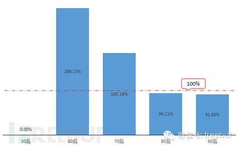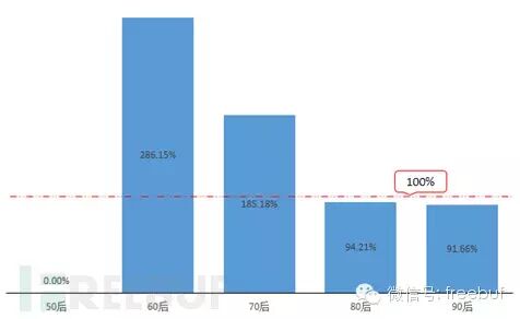 本次泄露事件中有81名用户使用了手机做密码。其中,60后的绝对占比(绝对占比即不同年龄段使用手机的占比与不同年龄段用户总数占比的比值)最高,并且随着年龄的降低,这一使用习惯绝对占比逐渐降低。